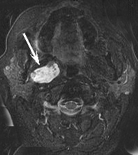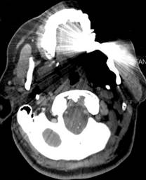 CT Scan and MR Scan from the same patient on the same day. On the left, metal scatter artifact from metallic fillings in the teeth almost completely obscure a tumor that is easily seen by MRI using metal suppressing techniques on the right.