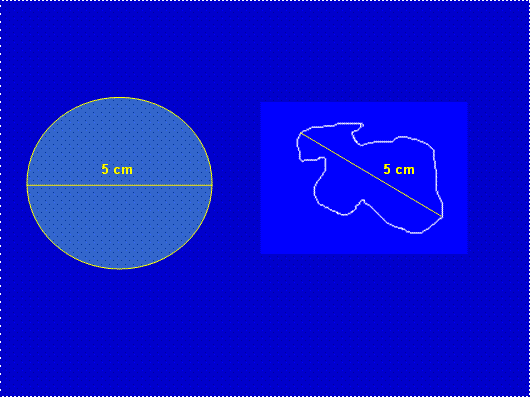 Imagine that the line drawing above was the tracing of a tumor, 3 months apart in the same patient after treatment. Clearly, the tumor has shrunk between the original time point (left) and the three months point (right) but if the protocol asks for measurements of the greatest dimensions, the result would be stable disease. That may end the trial of a drug.